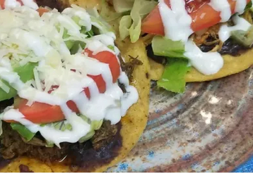 2 same crispy corn tortillas topped with beans, lettuce, tomato, avocado, cheese & sour cream.