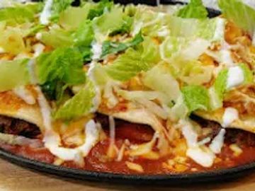 3 same corn tortillas baked in a green or red sauce topped with lettuce, cheese and sour cream served with rice and beans.