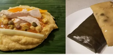 Two traditional El Salvadorian chicken tamales wrapped in banana leaf.