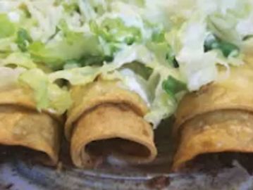 3 same crispy corn tortillas rolled with your choice: beef, chicken or pork. Topped with lettuce, cheese and sour cream.